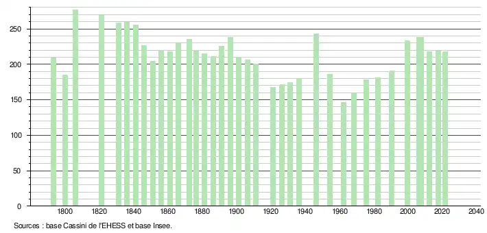 L'évolution du nombre d'habitants est connue à travers les recensements de la population effectués dans la commune depuis 1793. Pour les communes de moins de 10 000 habitants, une enquête de recensement portant sur toute la population est réalisée tous les cinq ans, les populations légales des années intermédiaires étant quant à elles estimées par interpolation ou extrapolation[19]. Pour la commune, le premier recensement exhaustif entrant dans le cadre du nouveau dispositif a été réalisé en 2007[20].