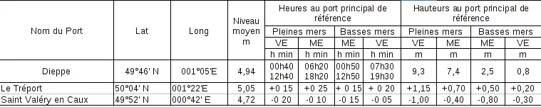 Des horaires moyens correspondant aux vives-eaux et aux mortes-eaux sont affichés pour le port principal. L'exemple ci-dessous mentionne le port principal de Dieppe et les deux ports qui lui sont rattachés.