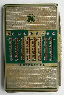 Addiator Arithma, permettant l'addition et la soustraction sur la même face, mais avec des tirettes distinctes.