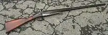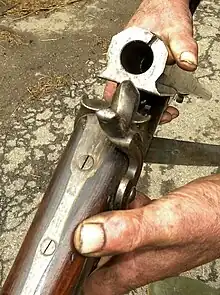 Un fusil de calibre 4, de fabrication Lefaucheux. Les munitions sont du type à broches. À noter l’impressionnante clé de verrouillage, placée en dessous et non au-dessus de la bascule.