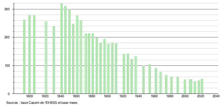 | L'évolution du nombre d'habitants est connue à travers les recensements de la population effectués dans la commune depuis 1793. Pour les communes de moins de 10 000 habitants, une enquête de recensement portant sur toute la population est réalisée tous les cinq ans, les populations légales des années intermédiaires étant quant à elles estimées par interpolation ou extrapolation[23]. Pour la commune, le premier recensement exhaustif entrant dans le cadre du nouveau dispositif a été réalisé en 2007[24]. En 2021, la commune comptait 52 habitants[Note 2], en augmentation de 20,93 % par rapport à 2015 (Gers : +0,79 %, France hors Mayotte : +1,84 %). |