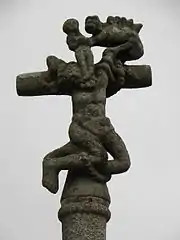 Une des croix porte le bon larron, Dysmas, dont l'âme, figurée par un petit personnage sortant de sa bouche, est recueilli par un ange. Sur l'autre se meurt le mauvais larron, Gestas, dont l'âme est empoignée par un démon aux allures préhistoriques.