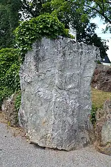Parmi tous les blocs réutilisés, quatre mégalithes sont identifiables d'après les sources historiques : les deux menhirs de Rougerand, prélevés à Saint-Vincent-des-Landes, le menhir de Petit-Bois (Louisfert) et une dalle provenant du Tertre Gicquel à Lusanger. Les menhirs de Rougerand sont deux blocs de quartz blanc, de respectivement 2,60 m et 2,40 m de hauteur, le plus grand des deux étant de forme effilée et le plus petit de forme parallélépipédique[2].