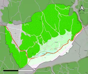L'occupation des sols de la commune, telle qu'elle ressort de la base de données européenne d’occupation biophysique des sols Corine Land Cover (CLC), est marquée par l'importance des forêts et milieux semi-naturels (60 % en 2018), en augmentation par rapport à 1990 (58,3 %). La répartition détaillée en 2018 est la suivante : forêts (58,3 %), zones agricoles hétérogènes (14,6 %), terres arables (12,9 %), zones urbanisées (9,9 %), eaux continentales[Note 8] (2,5 %), milieux à végétation arbustive et/ou herbacée (1,7 %), prairies (0,1 %)[42]. L'évolution de l’occupation des sols de la commune et de ses infrastructures peut être observée sur les différentes représentations cartographiques du territoire : la carte de Cassini (XVIIIe siècle), la carte d'état-major (1820-1866) et les cartes ou photos aériennes de l'IGN pour la période actuelle (1950 à aujourd'hui)[Carte 3].