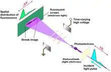 Les caméras à balayage optoélectroniques fonctionnent en dirigeant la lumière sur une photocathode qui, lorsqu'elle est frappée par des photons, produit des électrons par effet photoélectrique. Les électrons sont accélérés dans un tube à rayons cathodiques et traversent un champ électrique produit par une paire de plaques, qui dévie latéralement les électrons. En modulant le potentiel électrique entre les plaques, le champ électrique est rapidement modifié pour donner une déviation variable dans le temps des électrons, balayant les électrons à travers un écran luminophore à l'extrémité du tube[2]. Un détecteur linéaire, tel qu'un réseau de dispositifs à couplage de charge (CCD) est utilisé pour mesurer le motif de stries sur l'écran, et donc le profil temporel de l'impulsion lumineuse[3].