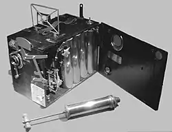 Caméra Sinclair Auto-Kine (1927), vue du côté du remontoir du ressort[1]. | |