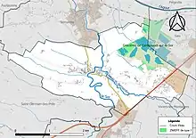 L'occupation des sols de la commune, telle qu'elle ressort de la base de données européenne d’occupation biophysique des sols Corine Land Cover (CLC), est marquée par l'importance des territoires agricoles (71,6 % en 2018), néanmoins en diminution par rapport à 1990 (90,2 %). La répartition détaillée en 2018 est la suivante : terres arables (45,7 %), zones agricoles hétérogènes (25,9 %), zones urbanisées (13,4 %), espaces verts artificialisés, non agricoles (8,3 %), zones industrielles ou commerciales et réseaux de communication (5,8 %), forêts (0,9 %)[21]. L'évolution de l’occupation des sols de la commune et de ses infrastructures peut être observée sur les différentes représentations cartographiques du territoire : la carte de Cassini (XVIIIe siècle), la carte d'état-major (1820-1866) et les cartes ou photos aériennes de l'IGN pour la période actuelle (1950 à aujourd'hui)[Carte 2].