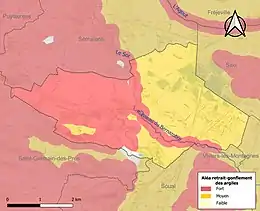 La commune est vulnérable au risque de mouvements de terrains constitué principalement du retrait-gonflement des sols argileux[27]. Cet aléa est susceptible d'engendrer des dommages importants aux bâtiments en cas d’alternance de périodes de sécheresse et de pluie. 99,4 % de la superficie communale est en aléa moyen ou fort (76,3 % au niveau départemental et 48,5 % au niveau national). Sur les 392 bâtiments dénombrés sur la commune en 2019, 392 sont en aléa moyen ou fort, soit 100 %, à comparer aux 90 % au niveau départemental et 54 % au niveau national. Une cartographie de l'exposition du territoire national au retrait gonflement des sols argileux est disponible sur le site du BRGM[28],[Carte 3].