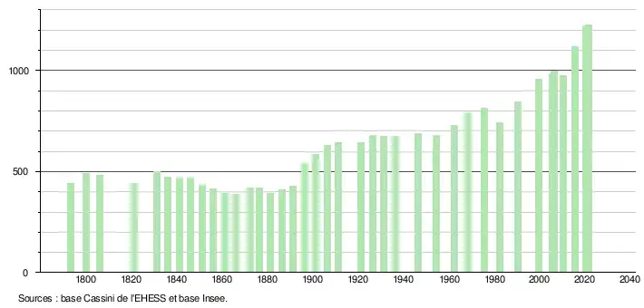 L'évolution du nombre d'habitants est connue à travers les recensements de la population effectués dans la commune depuis 1793. Pour les communes de moins de 10 000 habitants, une enquête de recensement portant sur toute la population est réalisée tous les cinq ans, les populations légales des années intermédiaires étant quant à elles estimées par interpolation ou extrapolation[37]. Pour la commune, le premier recensement exhaustif entrant dans le cadre du nouveau dispositif a été réalisé en 2005[38].