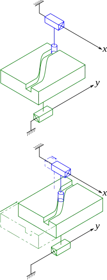 Dans l'exemple ci-contre, le galet est en contact avec le profil de gauche sur la première moitié du mouvement ; la came pousse le galet vers les x positifs, on est dans une phase d'accélération. Arrivé au milieu, la rainure présente une inversion de la courbure (point d'inflexion) ; le galet décolle du profil de gauche et vient en contact avec le profil de droite. La came pousse alors le galet dans le sens des x négatif, ce qui correspond à la phase de freinage.