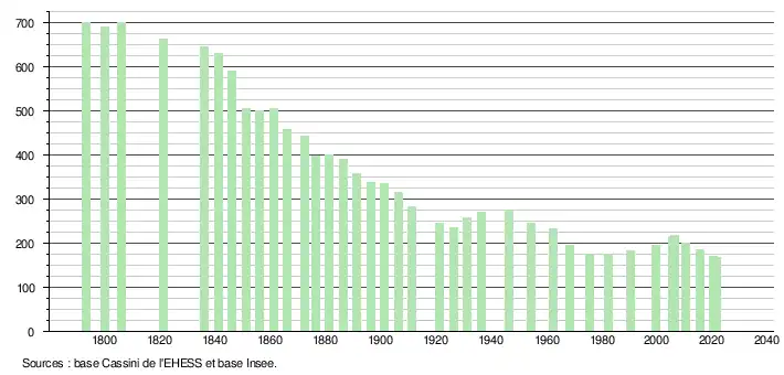 L'évolution du nombre d'habitants est connue à travers les recensements de la population effectués dans la commune depuis 1793. Pour les communes de moins de 10 000 habitants, une enquête de recensement portant sur toute la population est réalisée tous les cinq ans, les populations légales des années intermédiaires étant quant à elles estimées par interpolation ou extrapolation[21]. Pour la commune, le premier recensement exhaustif entrant dans le cadre du nouveau dispositif a été réalisé en 2005[22].