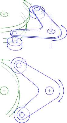 Considérons une pièce rigide en V. Cette pièce est montée sur un axe à la jonction des bras, dont on suppose qu'il n'a pas de mouvement de translation par rapport au référentiel que l'on se fixe. Elle a deux galets suiveurs aux extrémités des bras. Le contact de chacun des galets avec sa came impose donc l'orientation de la pièce. On peut ainsi créer un mouvement d'oscillation.