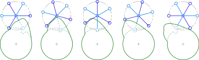 Dans la figure ci-contre, la roue menée effectue 1/6 de tour lorsque la came fait une révolution complète. La roue menée possède deux étages de trois galets suiveurs répartis de manière équidistante.