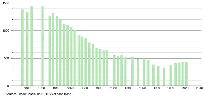L'évolution du nombre d'habitants est connue à travers les recensements de la population effectués dans la commune depuis 1793. Pour les communes de moins de 10 000 habitants, une enquête de recensement portant sur toute la population est réalisée tous les cinq ans, les populations légales des années intermédiaires étant quant à elles estimées par interpolation ou extrapolation[25]. Pour la commune, le premier recensement exhaustif entrant dans le cadre du nouveau dispositif a été réalisé en 2006[26].