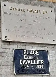 - À Nancy, un monument par Denys Puech est érigé sur la place Camille-Cavallier, en contrebas du Siège de la société des Hauts-Fourneaux et Fonderies de Pont-à-Mousson où l'industriel avait son bureau, et sur la façade duquel est apposée la plaque commémorative « Camille Cavallier, éminent ingénieur et économiste lorrain - Découvertes minières, créations industrielles et sociales, expansion française ».