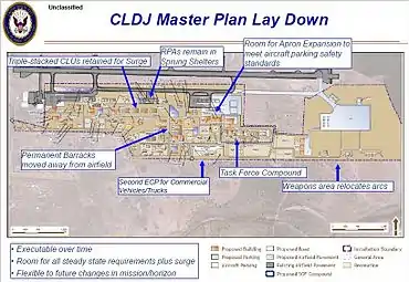 À la suite d'aménagements estimés à 1,32 milliard de dollars, cette base peut accueillir, en temps normal, 43 aéronefs, 2 100 hommes et 300 autres soldats d'une force opérationnelle auquel pourraient s'ajouter, en cas de besoin, 12 autres aéronefs, 1 500 hommes et 800 soldats d'une force opérationnelle[7].