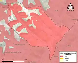 La commune est vulnérable au risque de mouvements de terrains constitué principalement du retrait-gonflement des sols argileux[21]. Cet aléa est susceptible d'engendrer des dommages importants aux bâtiments en cas d’alternance de périodes de sécheresse et de pluie. 84,1 % de la superficie communale est en aléa moyen ou fort (76,3 % au niveau départemental et 48,5 % au niveau national). Sur les 86 bâtiments dénombrés sur la commune en 2019, 83 sont en aléa moyen ou fort, soit 97 %, à comparer aux 90 % au niveau départemental et 54 % au niveau national. Une cartographie de l'exposition du territoire national au retrait gonflement des sols argileux est disponible sur le site du BRGM[22],[Carte 3].