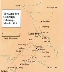 Après l'incident de Bắc Lệ (embuscade de Bac Le), pendant que l'escadre d'Extrême-Orient effectuait des opérations maritimes, le corps expéditionnaire reprend l'offensive et s'empare de Chu, Kep, Tuyen-Quan et Nui-Bop, obligeant les Chinois à se replier à l'est de Chu ().