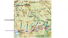 La rupture du front de Macédoine dans les derniers jours de crée la possibilité d'une remontée rapide des unités franco-serbes engagées face aux unités bulgares défaites[5]. Cette exploitation est menée principalement par des unités de cavalerie franco-serbes, appuyées par les quelques pièces d'artillerie qui leur sont adjointes, dans des contrées aux conditions physiques et climatiques particulières[27]. Une fois Uskub, en Macédoine serbe, conquise le au terme d'un raid audacieux, les unités austro-allemandes positionnées plus au Sud sont prises au piège et capitulent le [28].