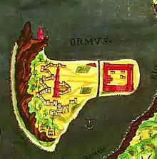 Le navigateur Afonso de Albuquerque passe en 1507 un accord avec les souverains d'Ormuz pour la construction d'une place forte sur l'île. Les travaux sont par la suite abandonnés mais le Portugal prend définitivement pied à Ormuz en 1515[1]. Voici comment Piri Reis, célèbre amiral ottoman qui prendra plus de 25 ans plus tard la tête des opérations pour déloger les Portugais décrit la position des Portugais dans son portulan Kitab-i Bahriye rédigé en 1526 :