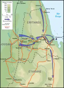 Menée dès le , la campagne dans l'Est de l'Afrique aboutit à la fin de l'année 1941 à la défaite des italiens sous les coups des Anglais, au nord, et des Belges au sud avec pour conséquence le démantèlement de l'Afrique orientale italienne. L'occupation italienne de l'Éthiopie prend fin en et l'empire d'Éthiopie est restauré, le Négus remontant sur le trône à Addis-Abeba.