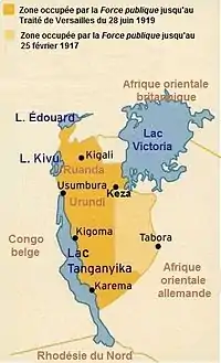 Le , les troupes allemandes stationnées au nord de leur colonie bombardent et attaquent Uvira, à l'extrême nord du lac Tanganyika et s'emparent de l'île d'Idjwi sur le lac Kivu. Le , le SMS Hedwig von Wissman[3] ouvre le feu sur le port d'Albertville et parvient à faire s'échouer l'Alexandre Delcommune[4] qu'il avait déjà tenté par deux fois de couler dans les jours précédents.