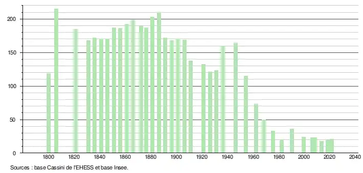 L'évolution du nombre d'habitants est connue à travers les recensements de la population effectués dans la commune depuis 1800. Pour les communes de moins de 10 000 habitants, une enquête de recensement portant sur toute la population est réalisée tous les cinq ans, les populations légales des années intermédiaires étant quant à elles estimées par interpolation ou extrapolation[15]. Pour la commune, le premier recensement exhaustif entrant dans le cadre du nouveau dispositif a été réalisé en 2008[16].