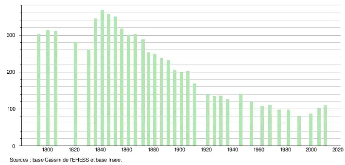 L'évolution du nombre d'habitants est connue à travers les recensements de la population effectués dans la commune depuis 1793. À partir du , les populations légales des communes sont publiées annuellement dans le cadre d'un recensement qui repose désormais sur une collecte d'information annuelle, concernant successivement tous les territoires communaux au cours d'une période de cinq ans. Pour les communes de moins de 10 000 habitants, une enquête de recensement portant sur toute la population est réalisée tous les cinq ans, les populations légales des années intermédiaires étant quant à elles estimées par interpolation ou extrapolation[15]. Pour la commune, le premier recensement exhaustif entrant dans le cadre du nouveau dispositif a été réalisé en 2005[16],[Note 2].
