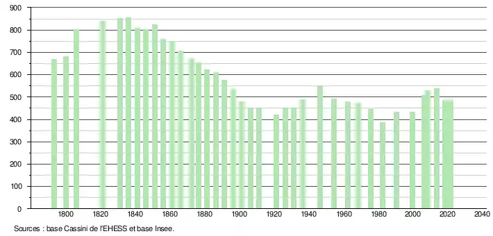 L'évolution du nombre d'habitants est connue à travers les recensements de la population effectués dans la commune depuis 1793. Pour les communes de moins de 10 000 habitants, une enquête de recensement portant sur toute la population est réalisée tous les cinq ans, les populations légales des années intermédiaires étant quant à elles estimées par interpolation ou extrapolation[31]. Pour la commune, le premier recensement exhaustif entrant dans le cadre du nouveau dispositif a été réalisé en 2008[32].