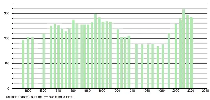 L'évolution du nombre d'habitants est connue à travers les recensements de la population effectués dans la commune depuis 1793. Pour les communes de moins de 10 000 habitants, une enquête de recensement portant sur toute la population est réalisée tous les cinq ans, les populations légales des années intermédiaires étant quant à elles estimées par interpolation ou extrapolation[29]. Pour la commune, le premier recensement exhaustif entrant dans le cadre du nouveau dispositif a été réalisé en 2005[30].