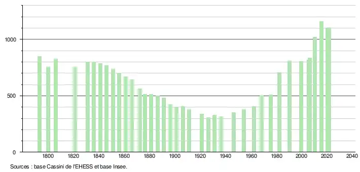 L'évolution du nombre d'habitants est connue à travers les recensements de la population effectués dans la commune depuis 1793. Pour les communes de moins de 10 000 habitants, une enquête de recensement portant sur toute la population est réalisée tous les cinq ans, les populations légales des années intermédiaires étant quant à elles estimées par interpolation ou extrapolation[22]. Pour la commune, le premier recensement exhaustif entrant dans le cadre du nouveau dispositif a été réalisé en 2005[23].