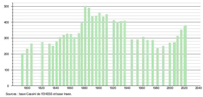 L'évolution du nombre d'habitants est connue à travers les recensements de la population effectués dans la commune depuis 1793. Pour les communes de moins de 10 000 habitants, une enquête de recensement portant sur toute la population est réalisée tous les cinq ans, les populations légales des années intermédiaires étant quant à elles estimées par interpolation ou extrapolation[36]. Pour la commune, le premier recensement exhaustif entrant dans le cadre du nouveau dispositif a été réalisé en 2005[37].