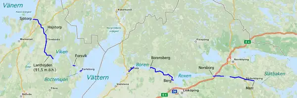 Le canal s'étend de la localité de Sjötorp sur la rive orientale du lac Vänern dans la province historique de Västergötland, via son point le plus haut le lac Viken (en), via le lac de Vättern, via le lac de Boren (en), via le lac de Roxen et se termine dans la baie de Slätbaken (pt) au niveau de la localité de Mem (sv) dans la région d'Östergötland après avoir traversé la ville de Söderköping.