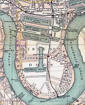 Canary Wharf se trouve sur l’Île aux Chiens, péninsule formée par un méandre de la Tamise et située dans Tower Hamlets, district londonien assez défavorisé économiquement situé dans l'East End, à quelques kilomètres à l'est de la City. Ce quartier tire son nom du latin « Canariae Insulae » (îles aux chiens) : les îles Canaries.