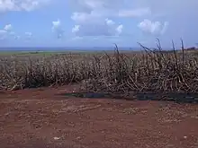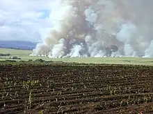 Traditionnellement, les champs de canne à sucre sont brûlés afin de faire fuir les serpents et autres animaux venimeux, et faciliter l'accès des coupeurs à des champs éclaircis et des tiges de cannes débarrassées de leurs feuilles mortes[34]. Ces feux spectaculaires brûlent intensément et s'éteignent très rapidement. Les coupeurs sectionnent la tige de la canne juste au-dessus du premier nœud, l'étêtent, et la coupent parfois en deux si elle est trop longue. La concentration en sucre est maximale dans la partie basse de la tige. Les têtes sont laissées au champ, auquel ils rendent une partie des nutriments en se décomposant. Des boutures peuvent aussi y être taillées. Les tiges de cannes sont ensuite rassemblées et chargées sur un camion qui les transporte jusqu'à l'usine qui est toujours proche des exploitations, car la dégradation du taux de sucre de la canne coupée est rapide : en 10 jours, 2,4 points de richesse en sucre en moins. Cette dégradation s'accompagne d'une perte de poids de l'ordre de 1 % par jour[35].