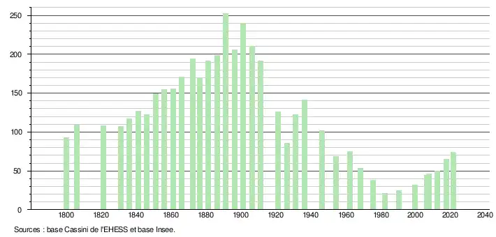 L'évolution du nombre d'habitants est connue à travers les recensements de la population effectués dans la commune depuis 1800. Pour les communes de moins de 10 000 habitants, une enquête de recensement portant sur toute la population est réalisée tous les cinq ans, les populations légales des années intermédiaires étant quant à elles estimées par interpolation ou extrapolation[8]. Pour la commune, le premier recensement exhaustif entrant dans le cadre du nouveau dispositif a été réalisé en 2007[9].