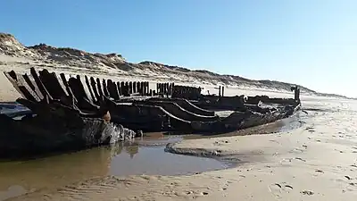 Progressivement détruite par l’océan et engloutie par les sables, l’épave a resurgi après une série de tempête en 2014. Elle est encore visible en bordure de plage à marée basse en 2021[5].