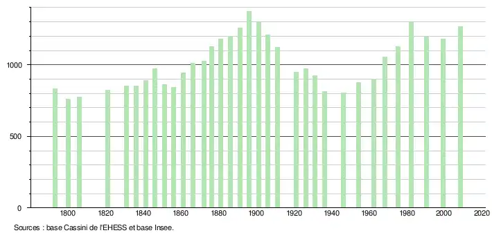 L'évolution du nombre d'habitants est connue à travers les recensements de la population effectués dans la commune depuis 1793. À partir du , les populations légales des communes sont publiées annuellement dans le cadre d'un recensement qui repose désormais sur une collecte d'information annuelle, concernant successivement tous les territoires communaux au cours d'une période de cinq ans. Pour les communes de moins de 10 000 habitants, une enquête de recensement portant sur toute la population est réalisée tous les cinq ans, les populations légales des années intermédiaires étant quant à elles estimées par interpolation ou extrapolation[3]. Pour la commune, le premier recensement exhaustif entrant dans le cadre du nouveau dispositif a été réalisé en 2008[4],[Note 1].