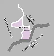 La partie de la commune d'Alençon intégrée dans le canton est celle située au sud d'une ligne définie par l'axe des voies et limites suivantes : depuis la limite territoriale de la commune de Saint-Germain-du-Corbéis, avenue de Koutiala, rue de Guerame, place Candie, rue Candie, rond-point, rue Antoine-Jullien, place du Commandant-Daniel-Desmeulles, cours Georges-Clemenceau, Grande-Rue, rue du Pont-Neuf, cours de la Sarthe, boulevard de la République, rue de la Fuie-des-Vignes, ligne de chemin de fer, cours de la Sarthe, jusqu'à la limite territoriale de la commune de Saint-Paterne.