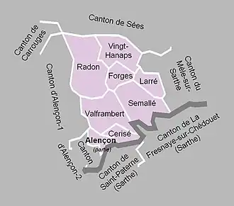À la suite du redécoupage des cantons pour 2015, les communes de Forges, Larré, Radon, Semallé et Vingt-Hanaps sont rattachées au canton de Radon, la commune de Valframbert à celui de Damigny et la commune de Cerisé ainsi que la partie d'Alençon de ce canton à celui d'Alençon-1.