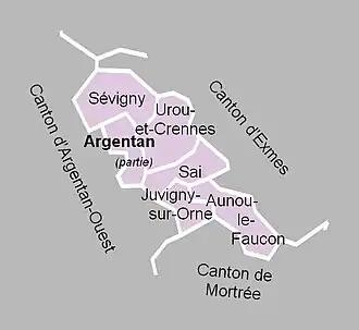 À la suite du redécoupage des cantons pour 2015, les communes d'Aunou-le-Faucon, Juvigny-sur-Orne, Sai et Sévigny sont rattachées au canton d'Argentan-1, tandis que la commune d'Urou-et-Crennes et la partie d'Argentan de ce canton sont rattachées à celui d'Argentan-2.