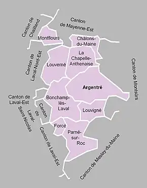 À la suite du redécoupage des cantons pour 2015, les communes d'Argentré, Bonchamp-lès-Laval, Châlons-du-Maine, La Chapelle-Anthenaise, Louverné et Montflours sont rattachées au canton de Bonchamp-lès-Laval et les communes de Forcé, Louvigné et Parné-sur-Roc à celui de L'Huisserie.