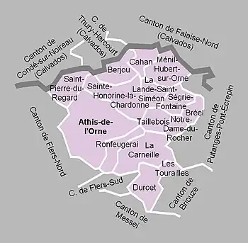 Lors du redécoupage de 2014, le canton d'Athis-de-l'Orne comprenait quarante-cinq communes entières[1].