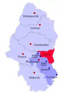 Représentation du canton d'Illzach au sein de l'arrondissement de Mulhouse et du département du Haut-Rhin tel qu'il existait jusqu'au 21 mars 2015.