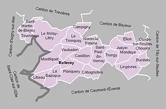 À la suite du redécoupage des cantons pour 2015, la commune de Lingèvres est rattachée au canton d'Aunay-sur-Odon, les communes de Campigny, Chouain, Condé-sur-Seulles, Ellon et Juaye-Mondaye à celui de Bayeux, la commune de Bucéels à celui de Bretteville-l'Orgueilleuse et les communes de Balleroy, La Bazoque, Cahagnolles, Castillon, Litteau, Le Molay-Littry, Montfiquet, Noron-la-Poterie, Planquery, Saint-Martin-de-Blagny, Saint-Paul-du-Vernay, Tournières, Le Tronquay, Trungy et Vaubadon à celui de Trévières.