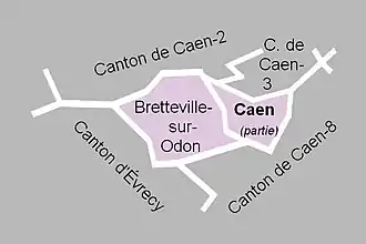 Le canton de Caen-I comprend les communes de Carpiquet, Bretteville-sur-Odon et de Louvigny ainsi qu'une portion du territoire de la ville de Caen[29].