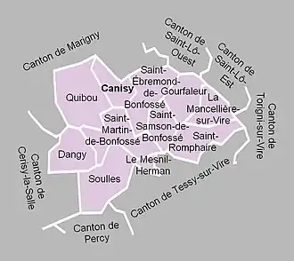 La carte des communes du canton. Les cantons limitrophes étaient ceux de Marigny, de Saint-Lô-Ouest, de Saint-Lô-Est, de Torigni-sur-Vire, de Tessy-sur-Vire, de Percy et de Cerisy-la-Salle.