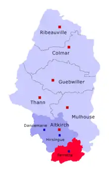 ![]() Représentation du canton de Ferrette au sein de l'arrondissement d'Altkirch et du département du Haut-Rhin |