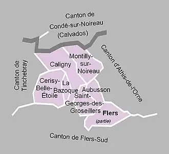 À la suite du redécoupage des cantons pour 2015, les communes de La Bazoque, Caligny et Cerisy-Belle-Étoile sont rattachées au canton de Flers-1, les communes d'Aubusson, Montilly-sur-Noireau et Saint-Georges-des-Groseillers à celui de Flers-2. La partie de la commune de Flers de ce canton est rattachée totalement au canton de Flers-2.