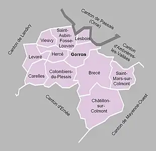 À la suite du redécoupage des cantons pour 2015, toutes les communes sont rattachées au nouveau canton de Gorron auquel s'ajoutent les neuf communes du canton de Landivy, six communes du canton d'Ambrières-les-Vallées et une du canton de Mayenne-Ouest.